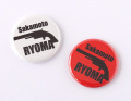 “Sakamoto RYOMA”の文字とともに龍馬愛用のピストルをデザインした缶バッジです。 白地に黒、赤地に黒の2色からお選びください。 バッジの直径は32mm。